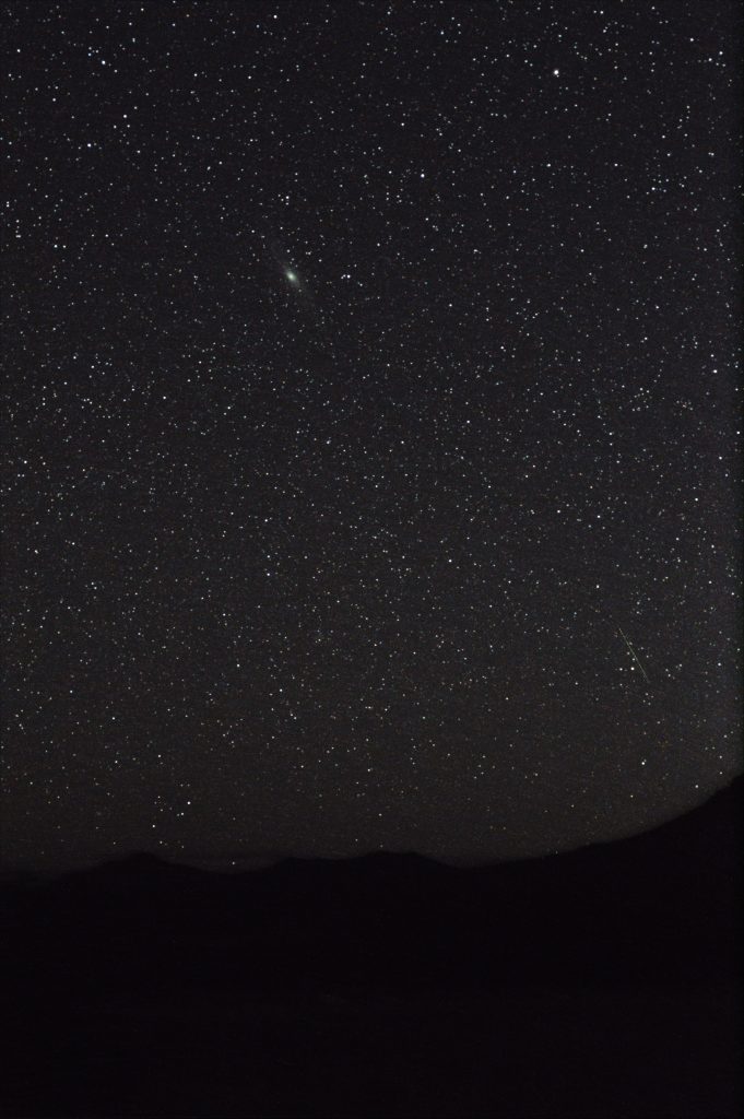 El algoritmo en cuestión es el de máximo, según comprendo, mantiene el valor más alto de cada pixel de cada toma en la pila. Las tomas individuales fueron tomadas en ISO 6400, cada una de 5 segundos, con una Nikon D90. A esa velocidad, para que algo se vea como un punto debe moverse muy lento y para que aparezca en la imagen debe brillar sobre el ruido de fondo. Muchas veces los satélites me han arruinado las fotos, casi siempre aparecen como líneas punteadas más que líneas de puntos, como traza de guiones. En este caso estaba seguro de que no sería un problema porque era cerca de medianoche (00:32), el atardecer había ocurrido hacía 4 horas a las 19:47 y la toma era hacia el norte y bastante bajo (menos de 15 grados)
